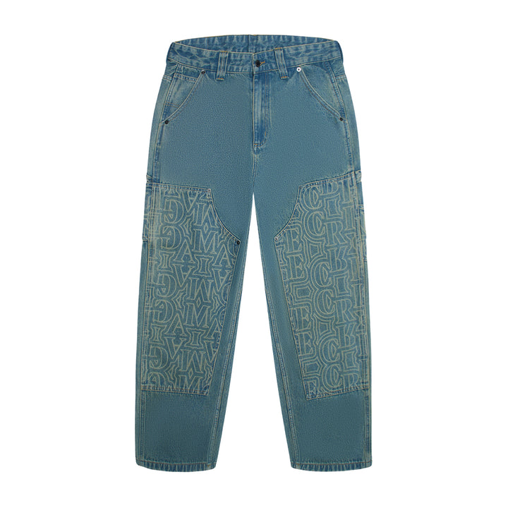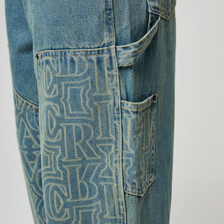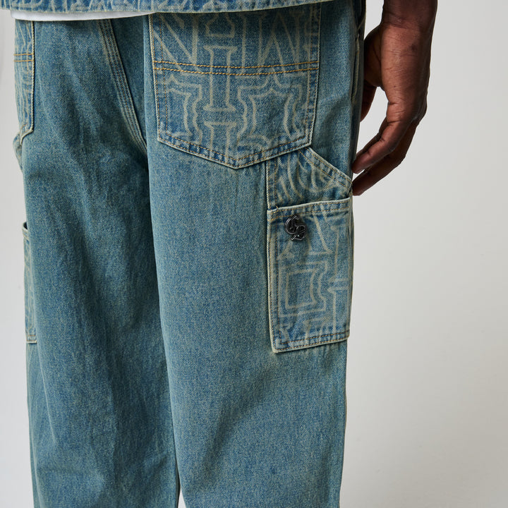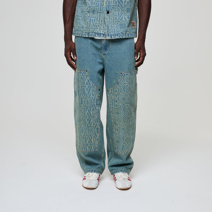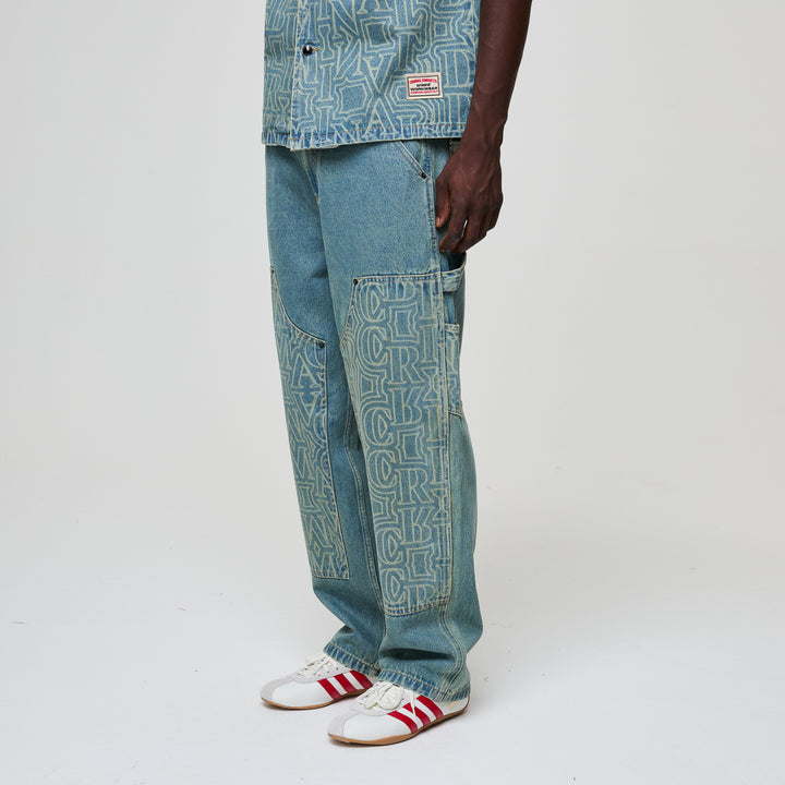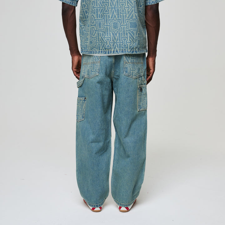 All over monogram, no ego. The Berkeley jeans balance maximal branding with clean design a boxy silhouette in laser printed cotton, finished with shank buttons, riveted patch pockets, and a point collar.