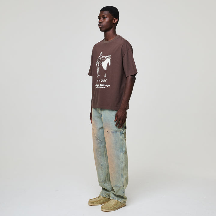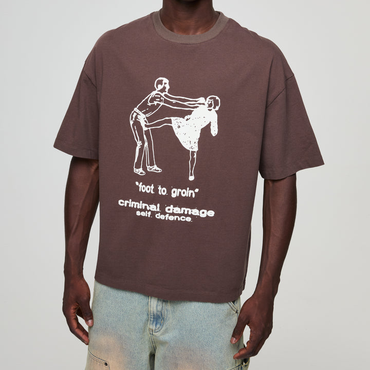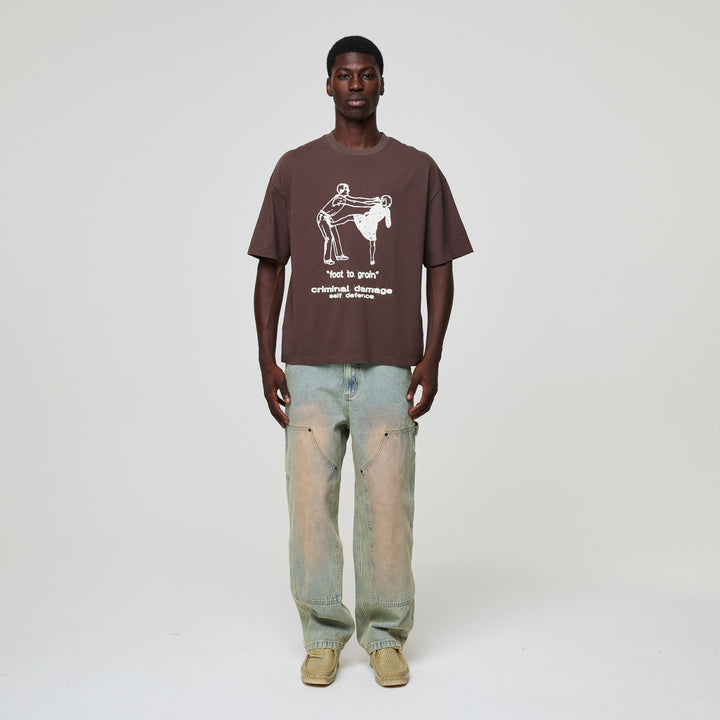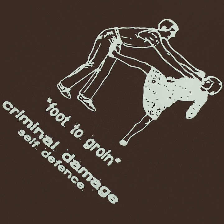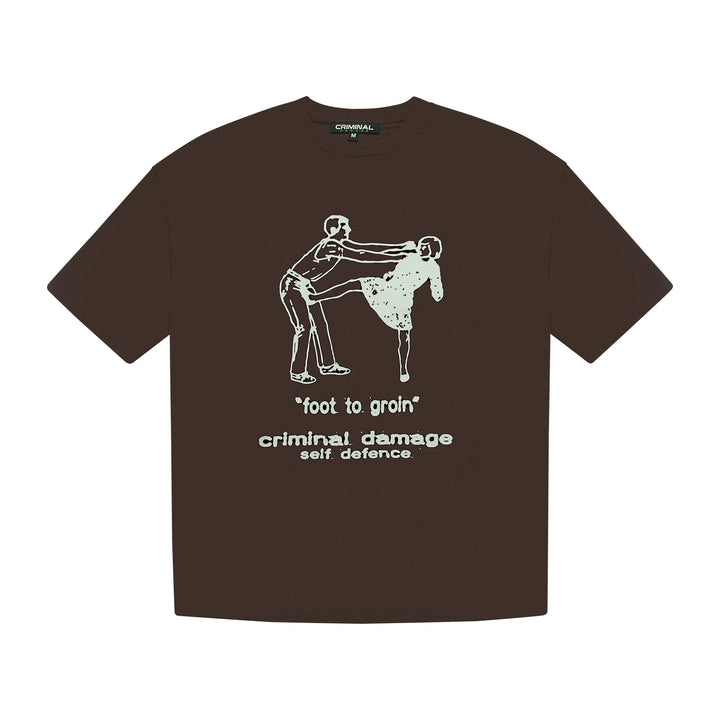 Self defense is key in this world, very key. Kick The Geezer in the Crotch. The Self Defence Tee plays with contrast calm exterior, bold message.